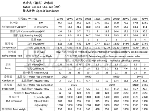 水冷式机组以水为冷却介质,在使用时需配一套冷却塔,它的作用是带走水冷式冷水机因为制冷而产生的热量.水冷式冷水机根据压缩机,结构或制冷温度不同,对它的称呼又不一样,比如水冷螺杆式冷水机,水冷箱式冷水机,水冷低温冷水机等.每一款冷水机都有自己*的特色.