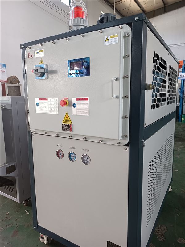 防爆冷水机,工业防爆冷水机是特殊冷水机组,设有多项安全保护装置,冷水机各组件均按国家防爆标准制造.能够满足客户的特殊要求.微电脑触摸式控制,操作简单易懂.可线控及报警信息输出,在实际操作中选择最佳的温度,能将温度精确控制在正负1度以内,保证质量,提高正品率